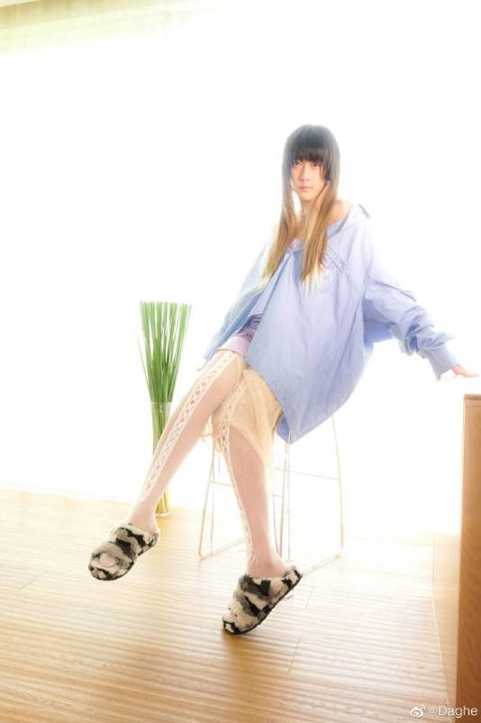 从图片中可以看出姜思达身穿蓝色衬衫,里面搭配着浅紫色的低调,戴着长长的假发,头发还是黄色的,脖子上还戴着珍珠项链,耳朵上还戴着耳钉,眼神魅惑,他下身穿着白色丝袜,脚踩黑色拖鞋,坐在凳子上腿抬起来,姿势也很诱人,给人一种很妩媚的感觉,就和真实的小女孩一样。