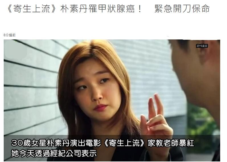 韩国女神朴素丹患甲状腺癌!曾演《寄生虫》一举成名,年仅30岁