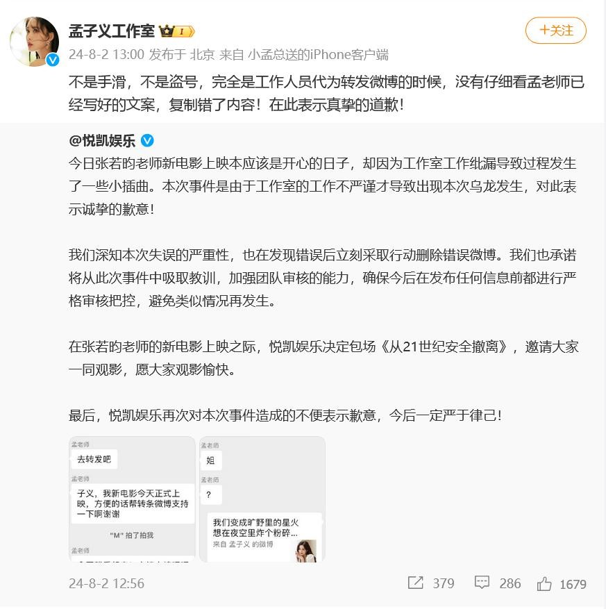 孟子义工作室转发悦凯娱乐的道歉文回应:“不是手滑,不是盗号,完全是工作人员代为转发微博的时候,没有仔细看孟老师已经写好的文案,复制错了内容!在此表示真挚的道歉!”