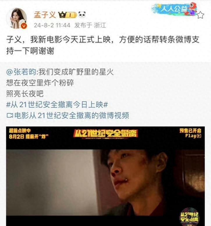 8月2日中午,孟子义发微博给张若昀宣传新电影,转发文案却是张若昀请求帮忙的原话。“子义,我新电影今天正式上映,方便的话帮转条微博支持一下啊谢谢。”