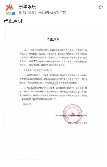 刚刚王一博经纪公司乐华娱乐发布声明称,近日有网友传播关于旗下艺人王一博#恋情的不实消息,对其造成了严重的不良影响。要求相关用户立即删除不实言论,否则将追究侵权者的法律责任。