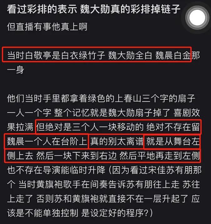 不过大部分网友认为,可能是编排走位太多次,测试了各种版本的,但又因为沟通上出现了一些失误和偏差,白敬亭以为是这一版走位,但其实不是,这样就能解释为啥魏大勋跟魏晨都准备上台阶了,结果白敬亭不动,他们流露出了一些意外感,而白敬亭在台上看向导演组时,疑似收到了暗示,表情瞬间有了变化,因为这时他这才可能发现自己走错了版本。
