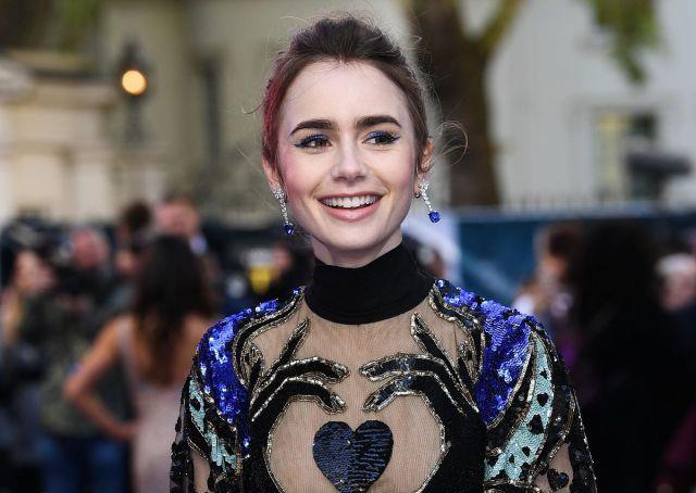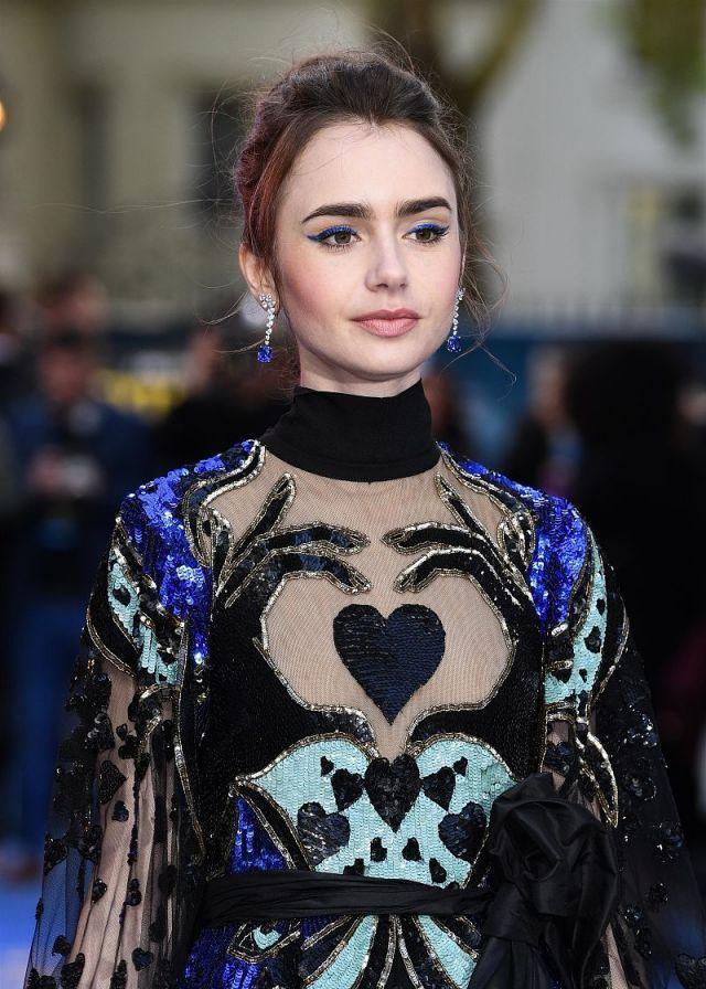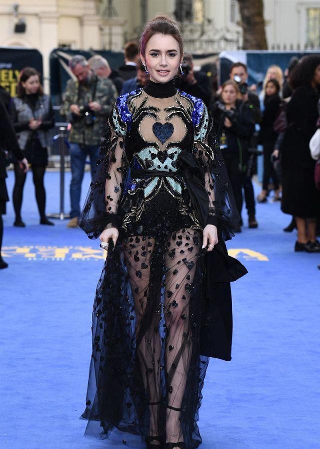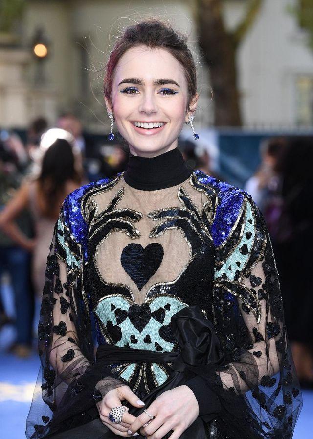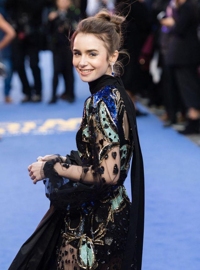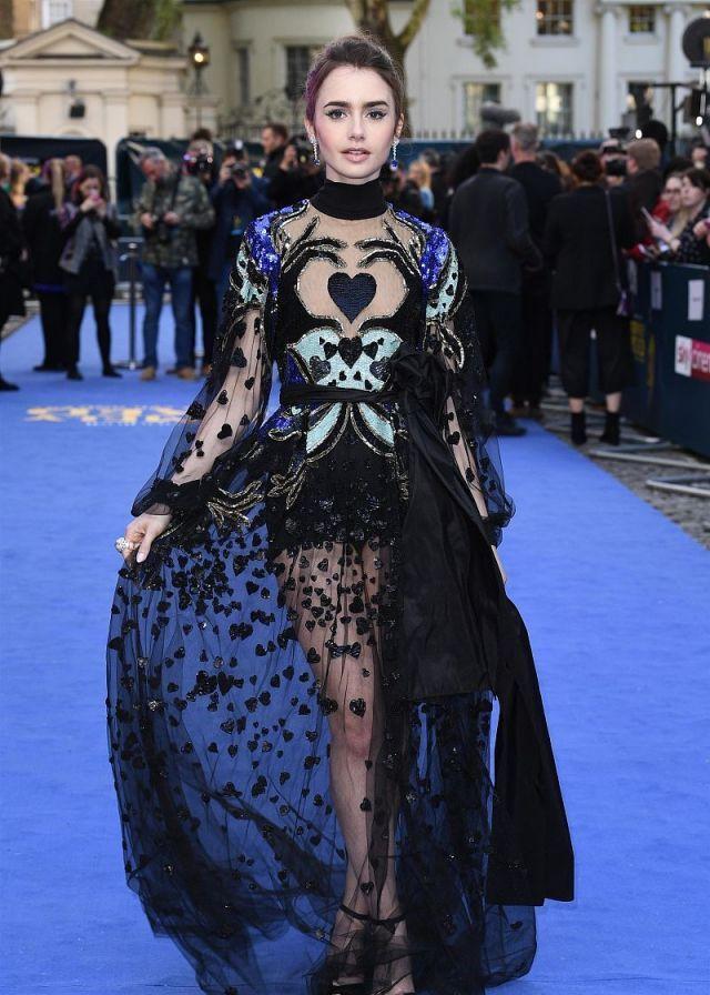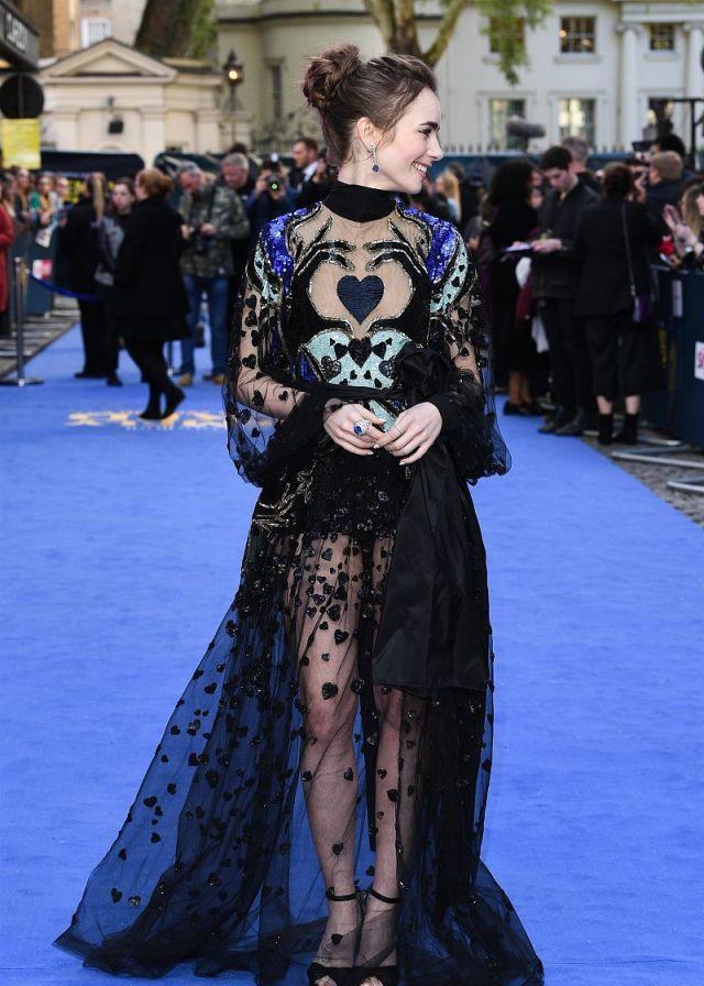 莉莉·柯林斯穿透视裙秀玉腿,胸前黑桃心超抢眼