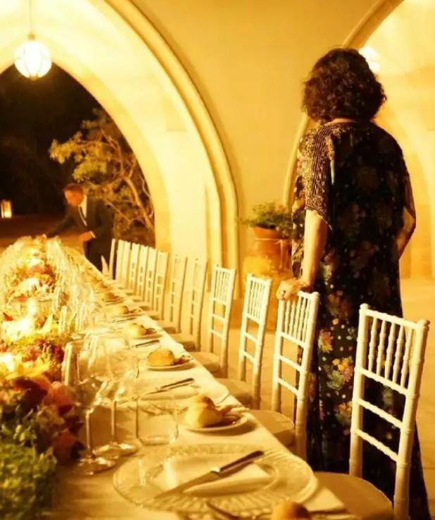 金星在这里宴请客人,拱形大门的造型,长长的餐桌大气磅礴,坐几十个人都没问题,餐桌上是精致的餐具和摆设,彰显品位。