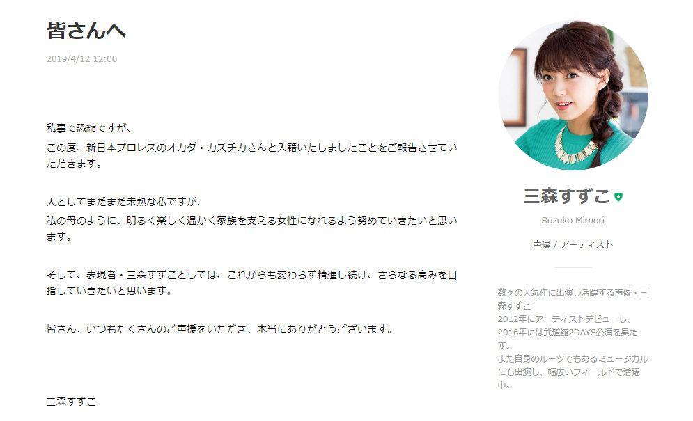 平成年的最后,又一位声优步入婚姻殿堂。今天,声优三森铃子通过自己的博客宣布了已经入籍的消息,对方是日本职业摔角选手冈田和睦。