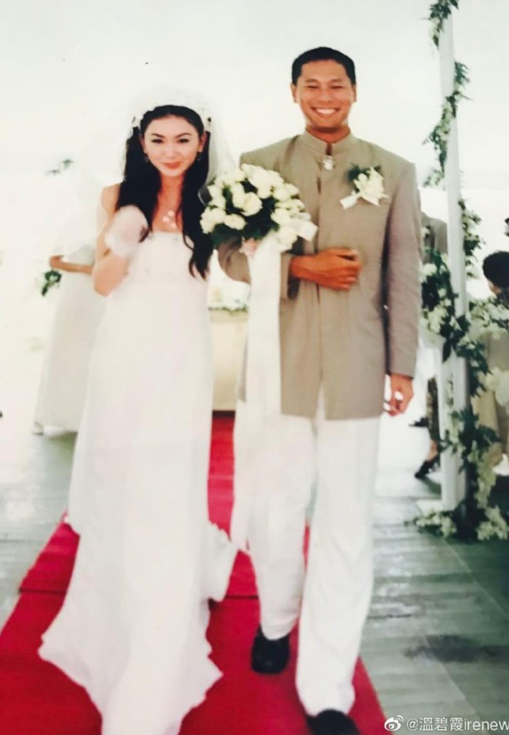 照片中温碧霞和丈夫郎才女貌十分登对,温碧霞穿着一身洁白的婚纱,肤白貌美,气质妩媚,不愧是性感女神。她的丈夫也是一表人才,身材高大,外貌不输男明星,难怪可以拿下温碧霞这位大美人。