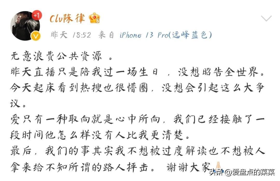 陈律也是一位网红博主,两个人在9月6日时在微博上官宣了恋情。他们的恋情登上热搜之后,陈律又发表了意见,说:“不想占用公共资源”,还说“爱只有一种取向就是心之所向”。