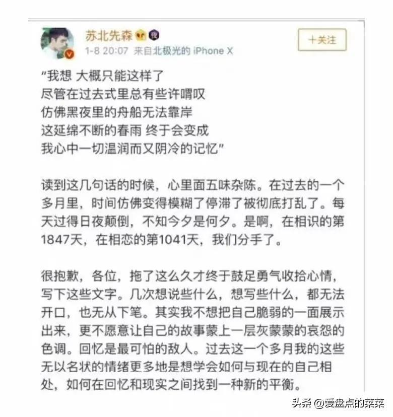 苏北先森曾经也是很受大家的欢迎,但是2019年1月8日,苏北宣布分手了,而后就再也没有了他们的消息。