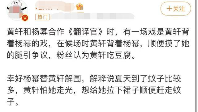 当时黄轩遭到了不少质疑。据媒体表示,后来杨幂替黄轩解围,称是夏天蚊子比较多,黄轩再帮她驱赶蚊子。