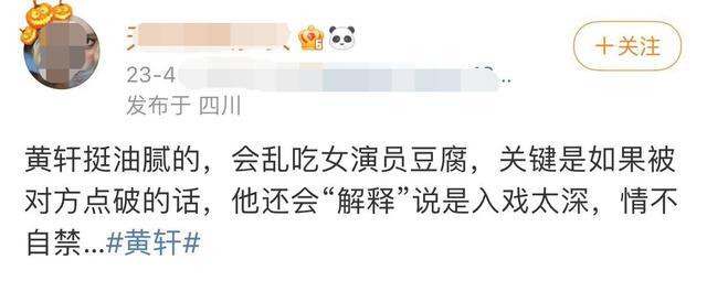 据这位娱记爆料,黄轩私下是一个油腻的人,他经常会乱吃女演员的豆腐。关键是如果 " 吃豆腐 " 一事如果被女演员发现的话,黄轩就会解释称是自己入戏太深,情不自禁。