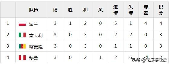 那意大利是否晋级了呢?三战三平只进两球,这样的表现可绝对称不上好。但事实就是他们真的晋级了。因为之前一天,波兰和秘鲁的比赛终于产生了本小组的唯一一场胜利,而且还是一场大胜。事实上两队的上半场比赛也是0:0互交白卷,但下半场比赛风云突变。先是武洛兹米尔·斯莫拉雷克在比赛第55分钟为波兰打进了本届世界杯的首粒进球,三分钟后拉托打进了个人三届世界杯的第10球,比分也变成了2:0。又过了三分钟,博涅克将比分改写为3:0。但波兰人没有就此停止进球,凭借着本科尔和武洛兹米尔·西奥莱克的进球,波兰人5:0领先,让比赛失去了悬念,秘鲁人直到比赛第83分钟才由吉列尔莫·拉罗萨打进挽回颜面的一球。最终波兰以一场5:1大胜拿下了小组第一,昂首晋级。