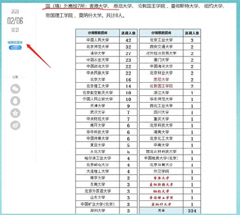 那么是什么呢?原来在2月6日,“博雅数据库”发布的关于北京市选调生名单的内容上,关于高校内容,竟然将“香港大学”特别标红,并且归入了境外高校一类。