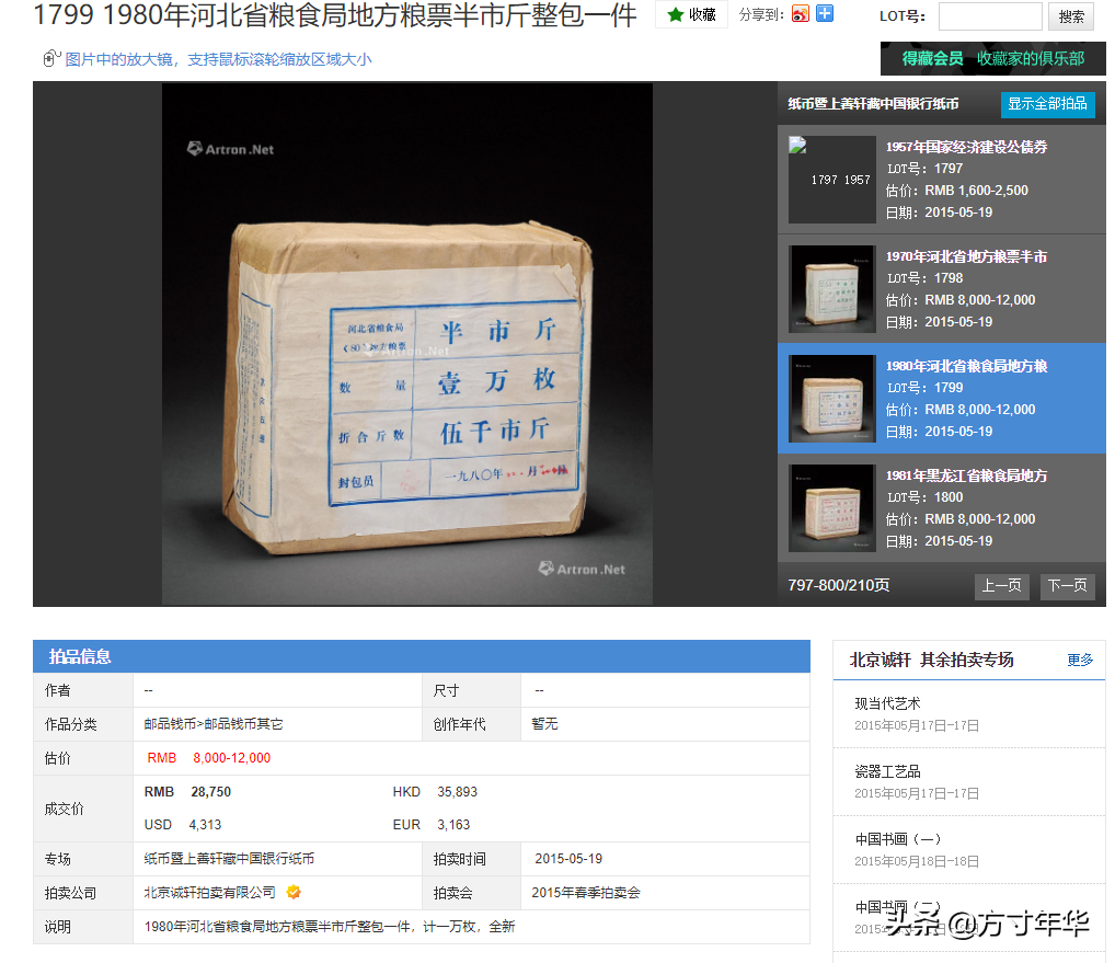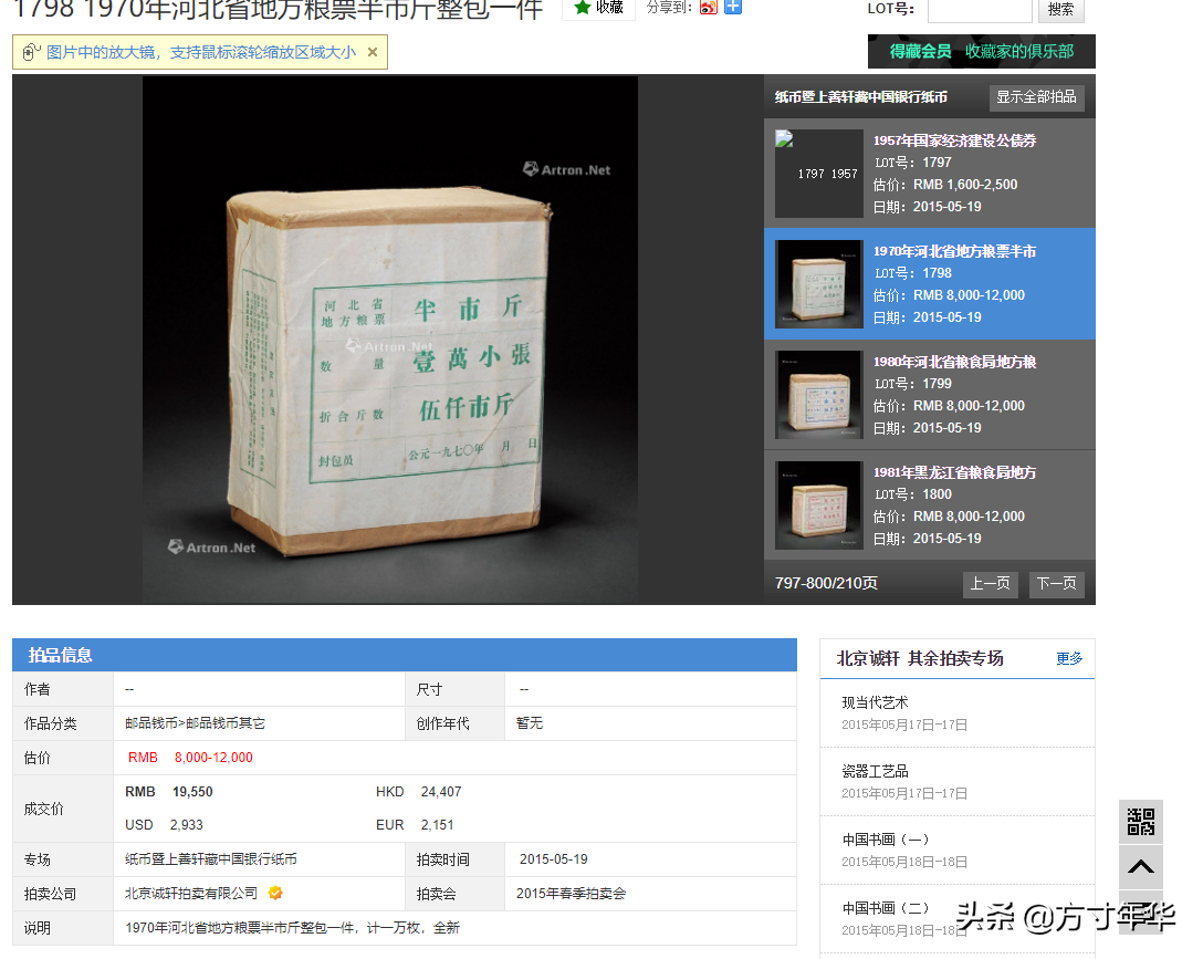 我在这篇文章中提到的粮票是中华人民共和国成立后发行的。在2015年成轩拍卖会上,几包粮票已经售出。虽然这些粮票的成交价格是1000元或2000元,但这个包的数量是1000元。平均来说,元。这仍然是一个新的整个包装。至于普通家庭收藏的流通品散布,更不值钱,至于你想卖,就更不用说了。除非有人可能买整包或者整刀,否则几乎很难卖。