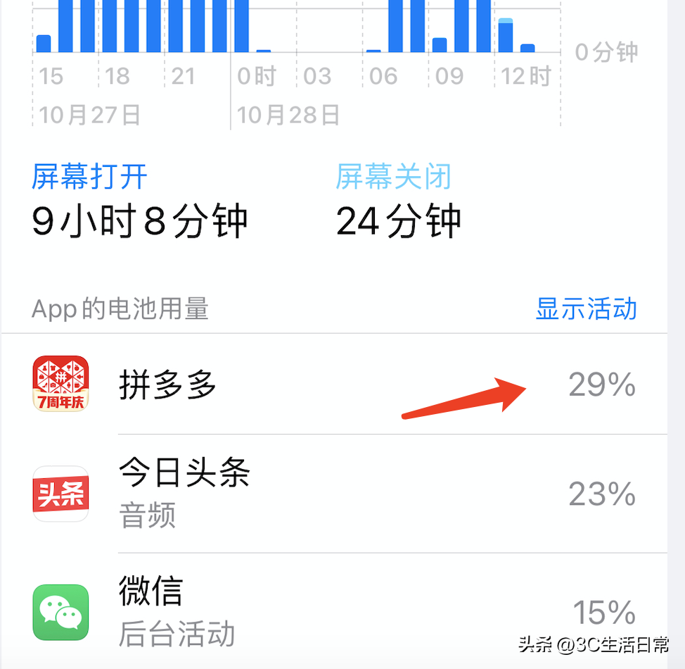点击上图箭头区域,可在电量和前台后台运行时间切换。查看升级到新系统后,手机上的哪个软件(app)在相同的时间下,消耗的电量最多。