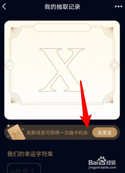 1点击进入手机群聊,点击右上角的三条杠2在群聊设置中,在最下方点进入群活跃中的群幸运字符3点击去抽卡按钮4在给出的几张幸运卡片中抽取一张字符卡5获取字符卡片之后,点击收下即可6最后在。
