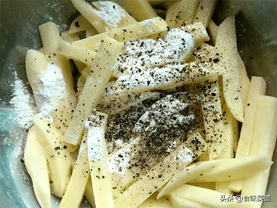 2、接着,我们依次撒上盐、淀粉和黑胡椒,翻拌均匀,让每一根薯条都充满了味道。