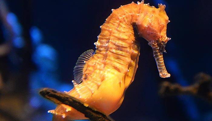 海马属头侧扁,头每侧有2个鼻孔,头部弯曲与体近直角,鱼体粗侧扁,完全包于骨环中;嘴是尖尖的管形,口不能张合,因此只能吸食水中的小动物为食物,眼睛可以分别地各自向上下、左右或前后转动;胸腹部凸出,躯干部由10~12节骨环组成,一般体长15~30厘米左右;尾部细长呈四棱形,尾端细尖,能卷曲握,常呈卷曲状;头部弯曲,与躯干部成一大钝角或直角,顶部具突出冠,冠端具小棘;吻呈管状;口小,端位;鳃孔小;全身完全由膜骨片包裹,有一无刺的背鳍,无腹鳍和尾鳍。背鳍位于躯干及尾部之间;臀鳍短小;胸鳍发达;无尾鳍;它的鳍用肉眼是不太容易看出来的。但用高速摄影,注意观察,可看到一根根活动的棘条。这些棘条能在一秒钟内,来回活动七十次的速度。依据从背鳍端传到另一端的波浪,海马能乘着此进行波,自由自在地作前后或上下的移动。雄鱼尾部腹侧具育儿囊,卵产于其内进行孵化,一年可繁殖2~3代。