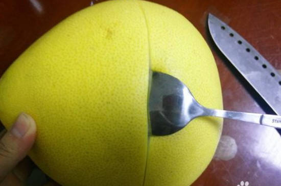 3、将勺子圆头戳入柚子皮下半部分,同样再把勺子慢慢戳入柚子内并用力将勺子划上一周。