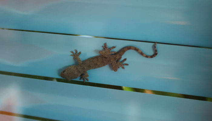 壁虎体背腹扁平,身上排列着粒鳞或杂有疣鳞。指、趾端扩展,其下方形成皮肤褶襞,密布腺毛,有粘附能力,可在墙壁、天花板或光滑的平面上迅速爬行。