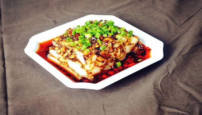 将绿豆淀粉和水按照1:6的比例进行混合,搅拌均匀后放到灶上,一边加热一边不停搅动,等到锅里的混合物全部变得透明,还要加少量的白矾。把加热完的混合物倒入一个容器里,慢慢凉却。全部凉下来的时候,就可以很容易地倒扣出来。把凉好的凉粉扣出在切熟食的案板上,切成喜欢的大小,放在容器里;拌上喜欢的调料――葱、蒜、生抽酱油、香油、盐、醋、辣椒油等,即可食用。