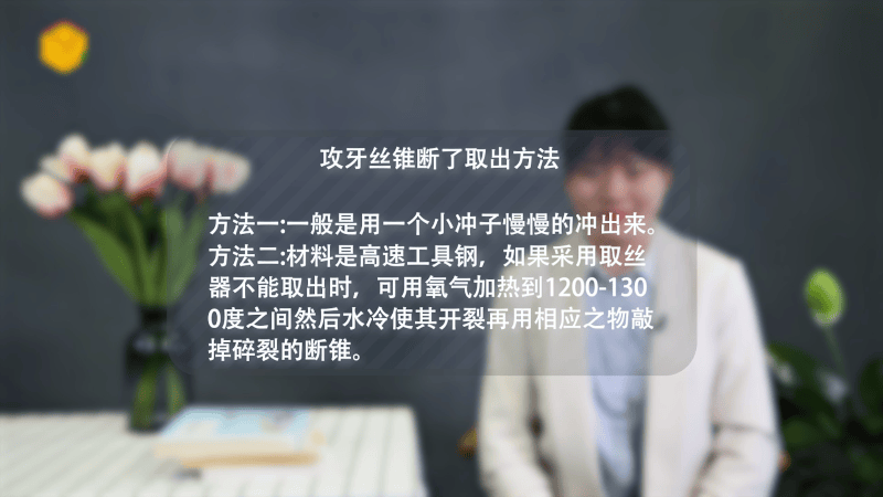 方法二:材料是高速工具钢,如果采用取丝器不能取出时,可用氧气加热到1200-1300度之间然后水冷使其开裂。再用相应之物敲掉碎裂的断锥。这就是攻牙丝锥断了取出的小方法。