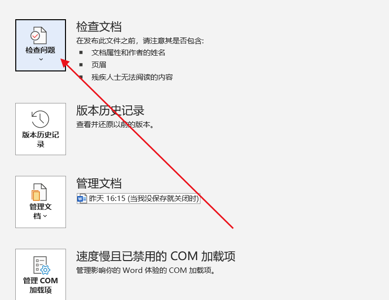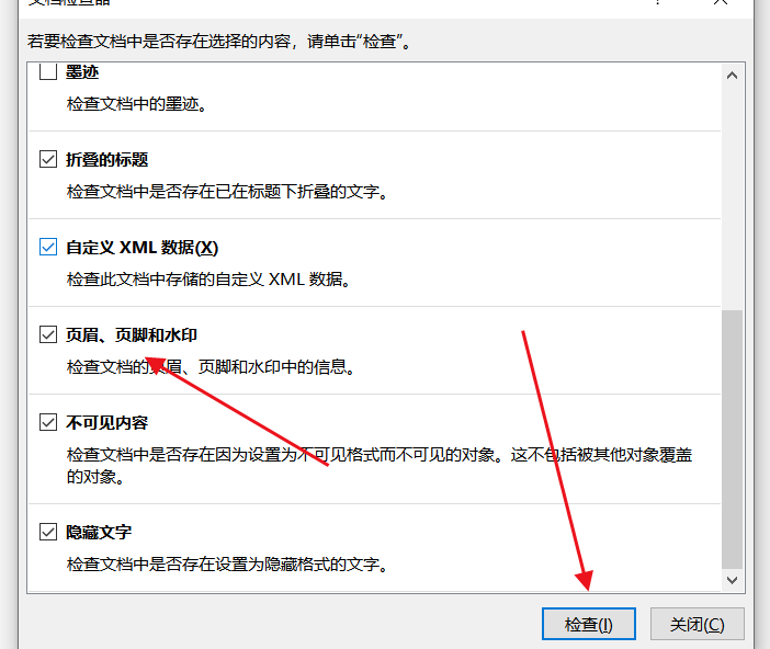 选择检查文档,勾选页眉页脚和水印的选项,点击检查