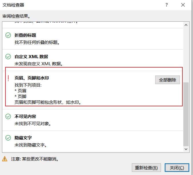检查之后就发现检查出文档中存在页眉水印,点击全部删除就可以了