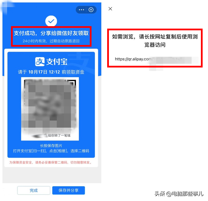 点击“转账”会生成一个二维码,把这个二维码发给QQ、微信等好友,对方保存后,用支付宝扫码,即可领取。(微信扫码无效)
