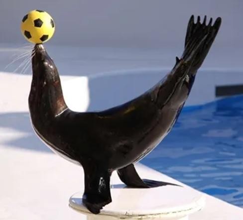 海狮,长着耳朵和后腿,擅长顶球。