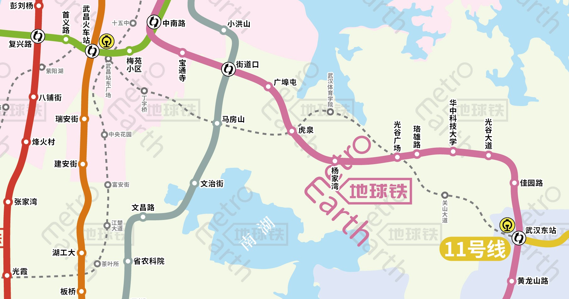 现有的2号线和11号线在【武汉东站】相交换乘,在建的11号线二期工程将强化【武昌火车站】与【武汉东站】的联系,链接这两大铁路枢纽。