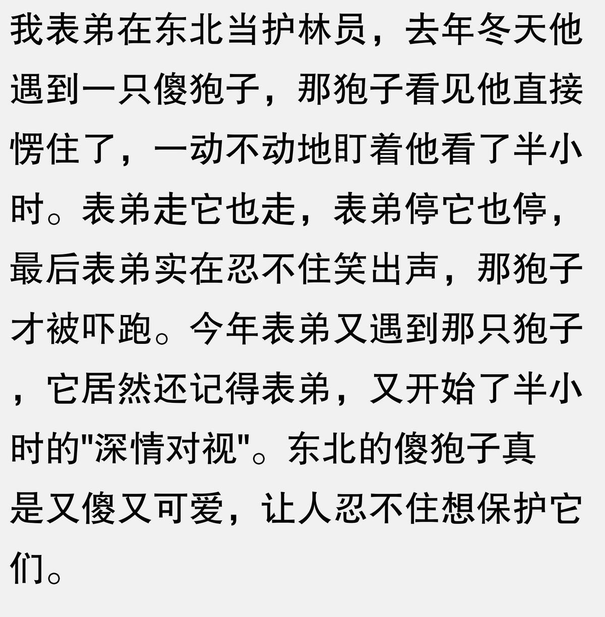 小时候在东北山里见过傻狍子,有次下雪天它看到雪地里的脚印,以为是同类,傻乎乎地跟着脚印转圈圈,转了一整天,最后累得趴在雪地里睡着了。后来听说那只傻狍子被狼叼走了,真是又蠢又可怜。