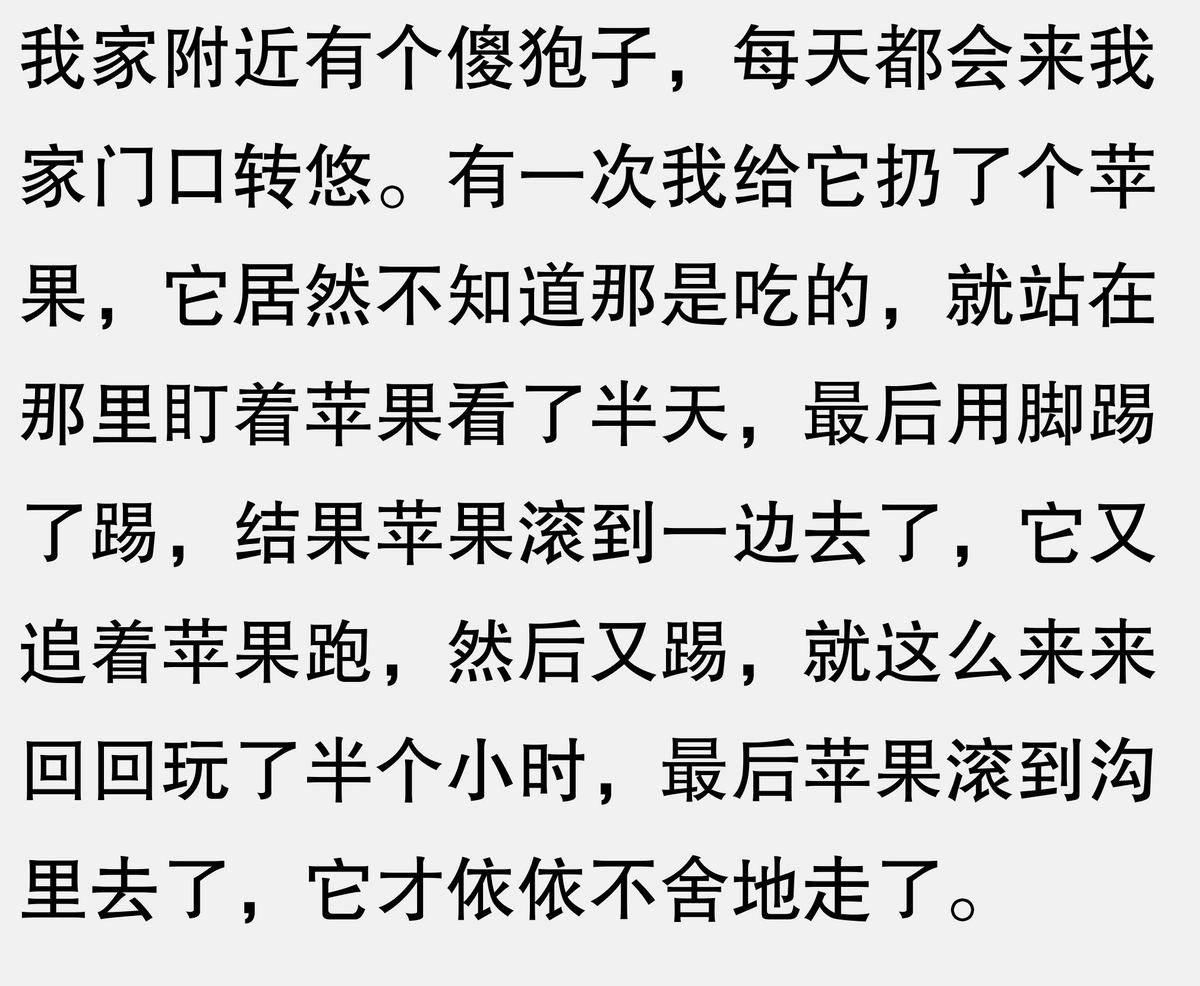 我家楼下有个大爷养了一只傻狍子,天天在小区里溜达。那狍子见人就凑上去闻,有一次看见一个小孩骑自行车,它居然跟在后面追,结果撞树上了。最搞笑的是它被撞了也不跑,就站在那儿愣愣地看着树,好像在想这树怎么突然冒出来了。大爷说它就这样,看见啥都好奇,经常自己把自己逗乐了,真是个活宝。