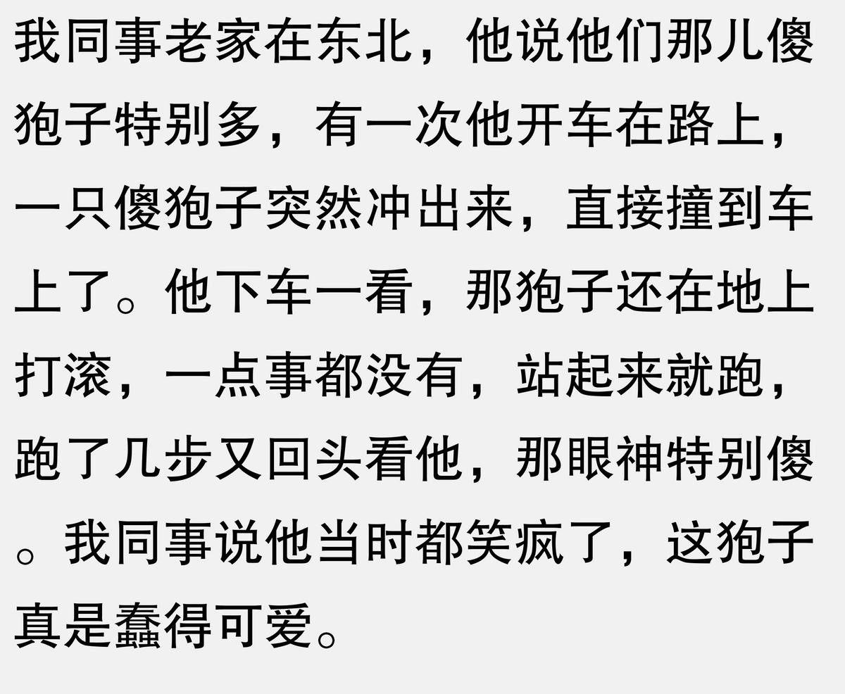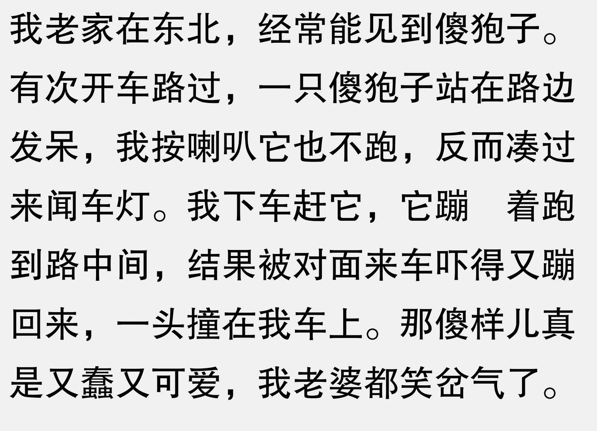 我老家一个傻狍子,看到车灯就直接冲上去,然后被撞了还躺在地上装死,司机下车查看它立马跳起来跑掉。司机被吓得半死,它还在原地转圈圈。现在村里人都知道这货,开车经过那片林子都特别小心。