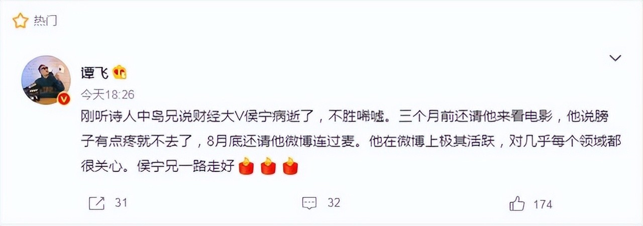 媒体:财经大V侯宁猝然离世,坐拥400万粉丝,李大霄、管清友等发文悼念