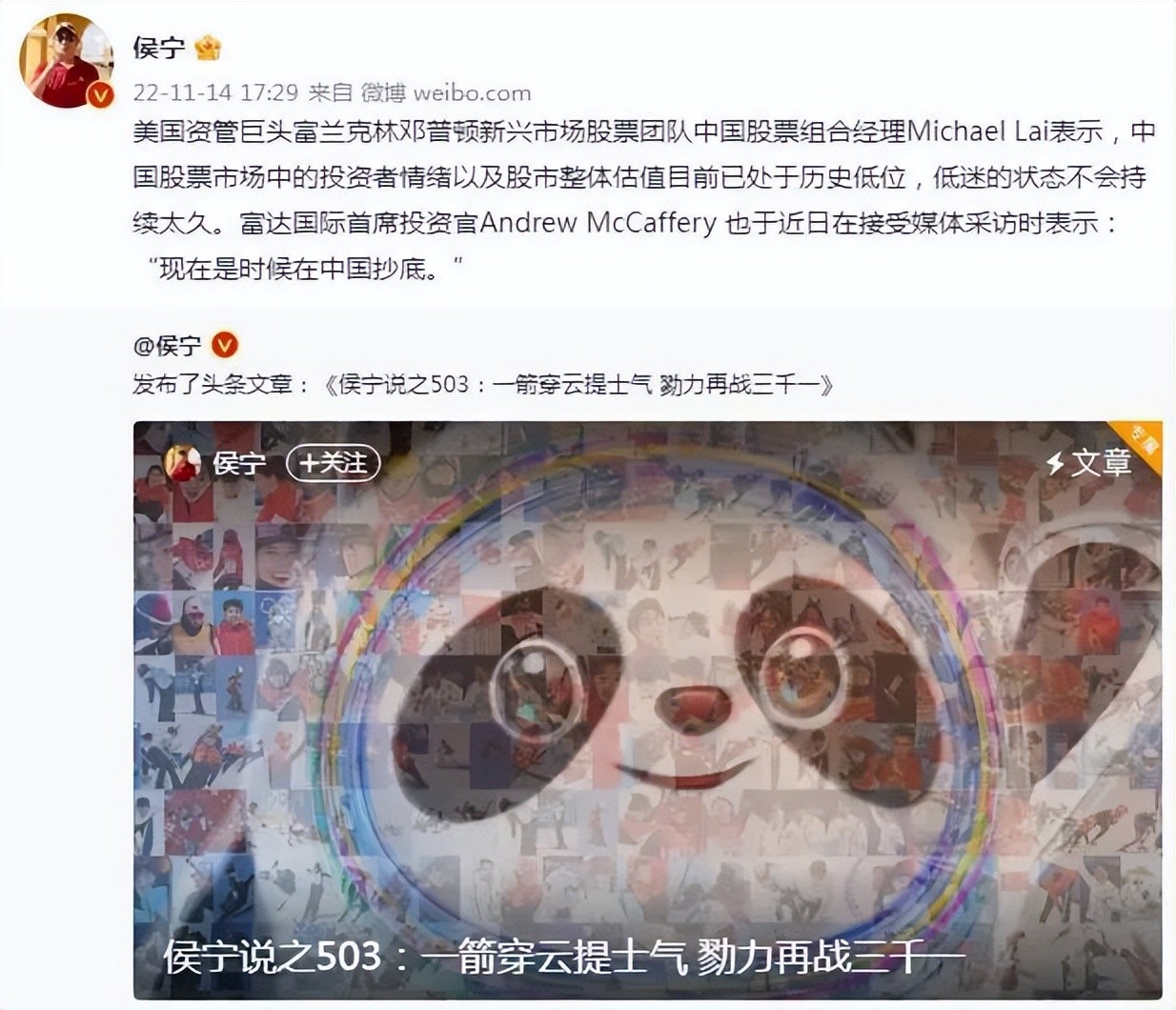 11月13日,侯宁在微博发布了最后一篇股评,标题是《一箭穿云提士气 勠力再战三千一》。次日,他转发了这篇文章,并配上了外资投行看多A股的消息。