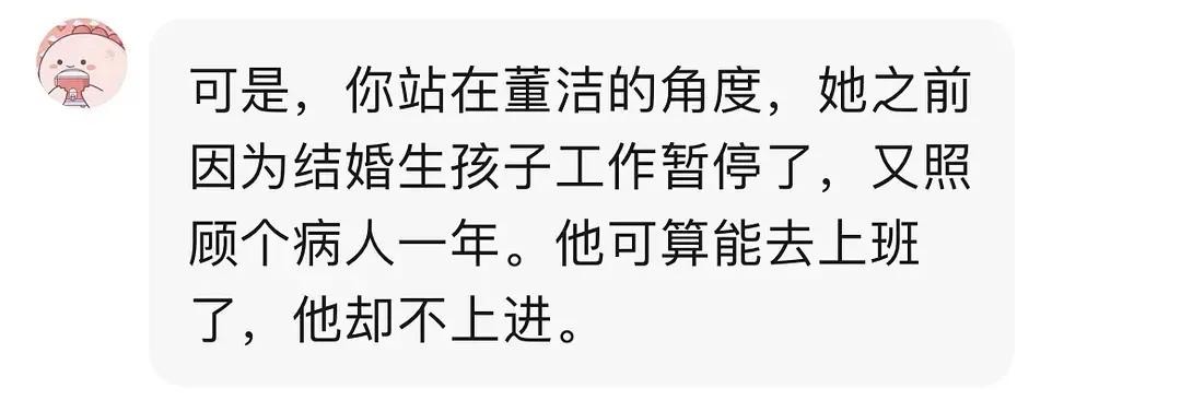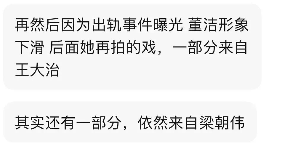 简概一下就是,生完孩子后的董洁非常渴望资源和回到事业巅峰,所以出轨王大治,就是想要西北圈资源,对于人丑不丑是次要的,因为当时的前夫帮不了她。