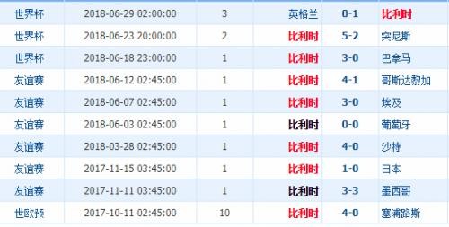 比利时近10场比赛,球队共取得8胜2平0负的战绩,平均进球2.80个,平均失球0.60个