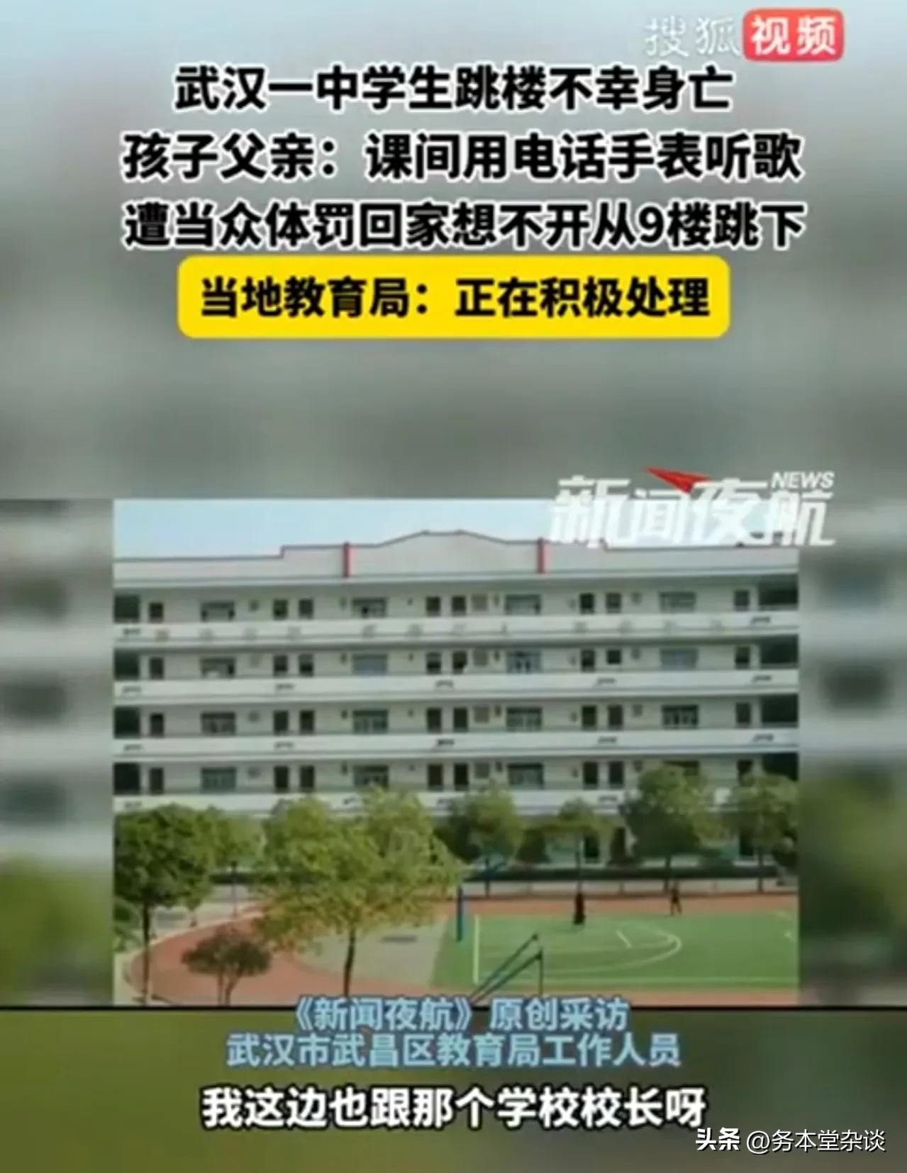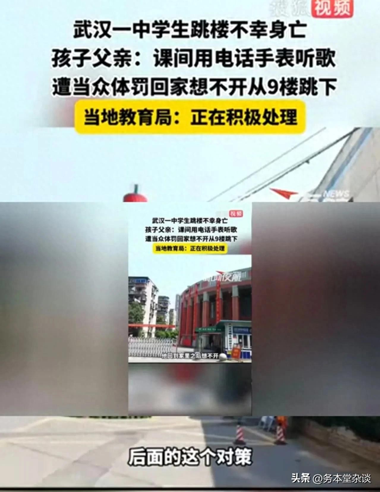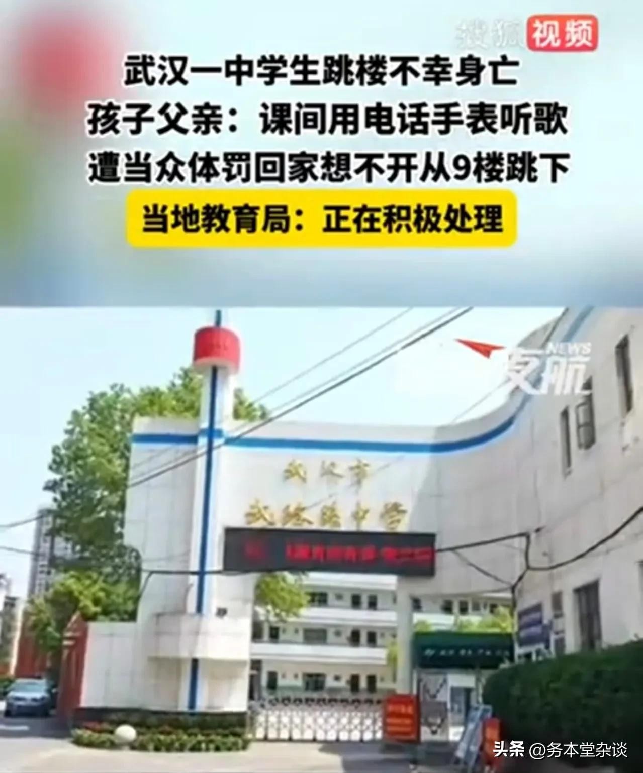 2月22日,黑龙江都市频道“新闻夜航”报道了一则悲剧:近日,湖北武汉珞珞中学一名学生在放学回家后跳楼身亡。有声音将孩子的轻生归咎于学校老师。据死者父亲透露,孩子因在课间使用电话手表听歌被老师发现,老师当众批评并收走了手表,还动手打了孩子。孩子感到委屈,回家后想不开,选择了跳楼。目前,公安已介入调查,最终结果应以公安调查为准。