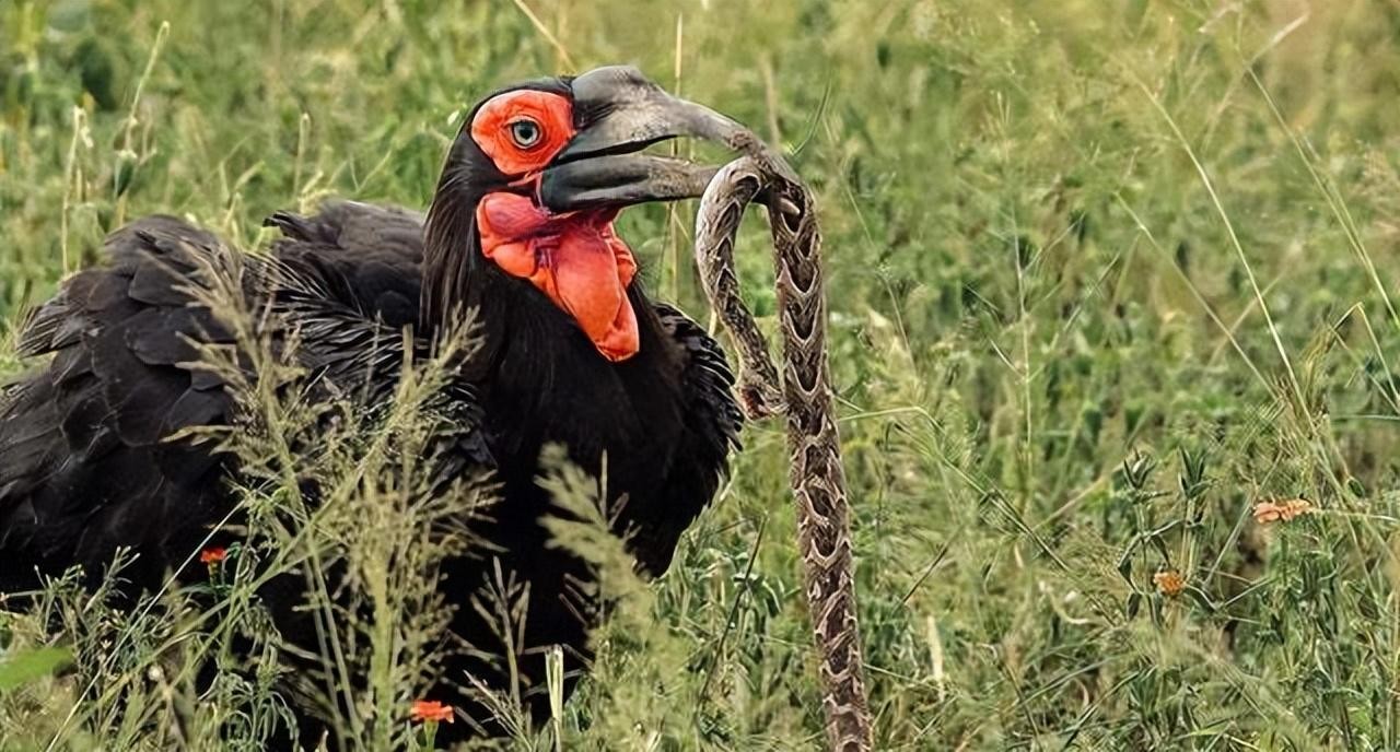 19.地犀鸟是犀鸟的一种,比起那些张着大嘴吃野果的亲戚,地犀鸟的战斗力可强多了!