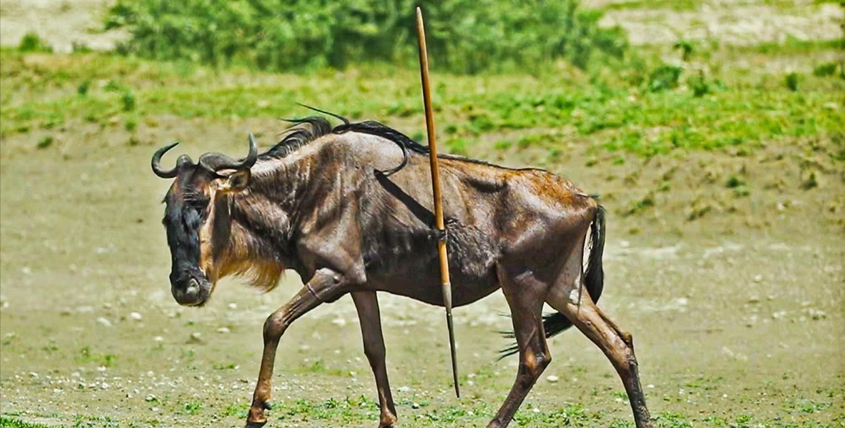 15.这只角马在人类的猎杀中侥幸逃脱,但它的一侧身体还插着一支长矛。