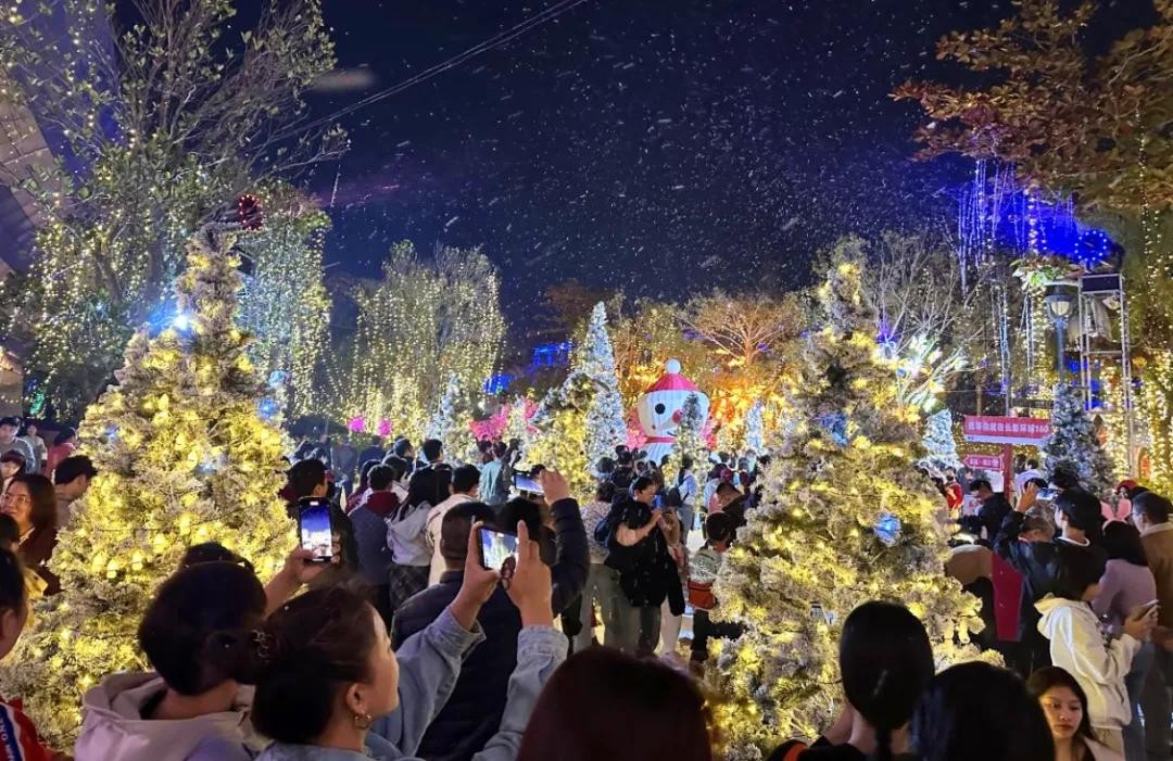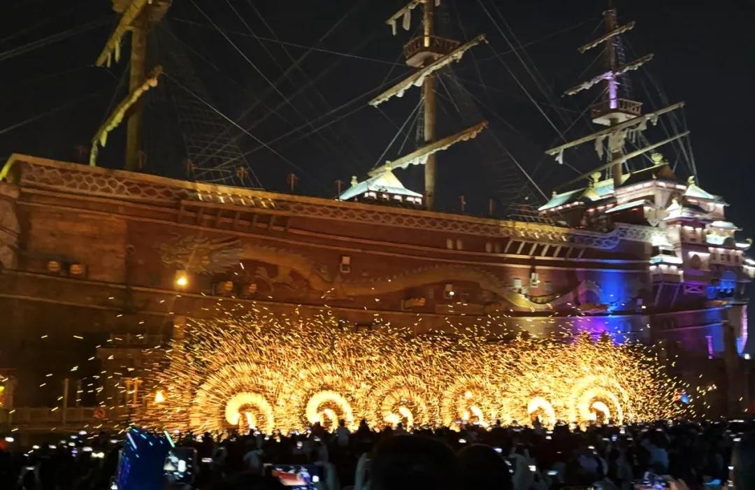 当夜幕降临,五彩斑斓的灯光秀璀璨登场,在夜色下熠熠生辉,瞬间营造出了极为浓厚的节日氛围,仿佛将整个乐园都笼罩在了梦幻的光影世界之中。值得一提的是,飘雪派对为身处南方的市民游客们带来了难得一见的雪景体验,大家在纷纷扬扬的 “雪花” 中尽情嬉戏,感受别样的浪漫;水上飞人火壶表演更是凭借惊险刺激的特技动作,赢得了现场观众的阵阵热烈掌声。极限飞车表演、千年非遗打铁花以及篝火晚会等节目轮番上演,为市民游客呈现了一个难忘的夜晚。千年非遗文化与现代演艺完美融合,为市民游客带来了一场震撼人心的视听盛宴。
