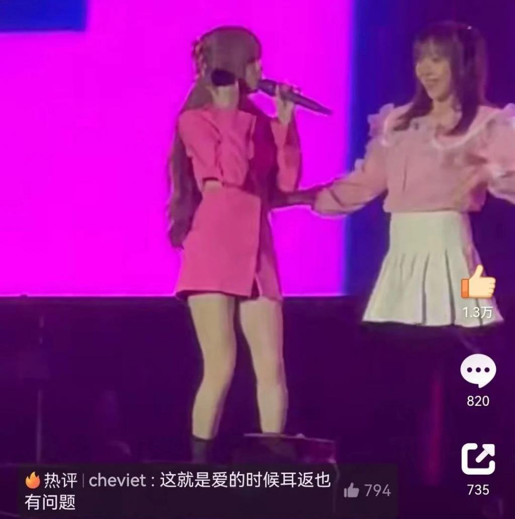 唱完第一段之后,她便一边唱跳,一边频频朝着主办方工作人员指了指耳返,示意耳返听不见声音。