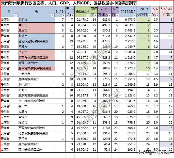 一、云南贵州25个地级行政区人口、面积、GDP总量、人均GDP排名(详见下表)