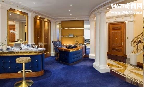 用“金碧辉煌”来形容这间复式皇家套房再合适不过了。极尽铺张之能事的楼梯上铺着豹纹地毯,走在这样的房间里很容易让人忘记自己的身份。既然是皇家套房,那当然是专门为皇室君主设计的。占地面积达惊人的780平方米,内部除了有一个像国家议会般装修精致的会客厅外,还有一间书房、一个电影厅和两个自带浴室的主卧。浴室内都有按摩浴缸、花洒豪华淋浴头。