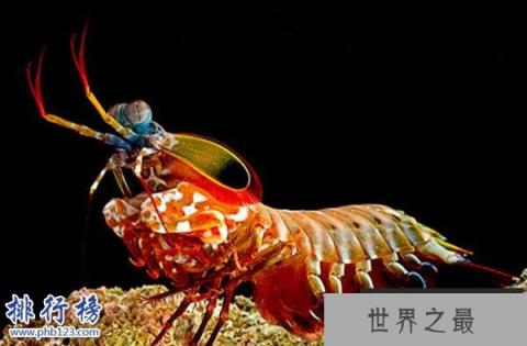 雀尾螳螂虾全身五色斑斓的,十分吸引人的眼球,被人们称为世界上最漂亮的虾。然而俗话说越美丽月危险,雀尾螳螂虾漂亮不假,但它性情十分刚烈,攻击力非常强,是世界上最凶猛的虾。它胸前大螯钩有超强的弹射力,比子弹的速度还要快,快到在水中可以产生冲击波。下面VIP世界之最(1357vip.com)就为大家带来详细榜单。