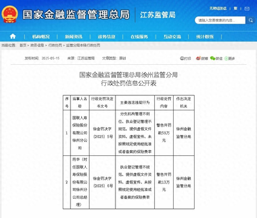与此同时,时任国联人寿徐州分公司总经理的符华,也因在执业登记管理、提供虚假文件资料、虚假宣传和未合规使用保险费率等方面负有责任,受到警告并被罚款13万元。