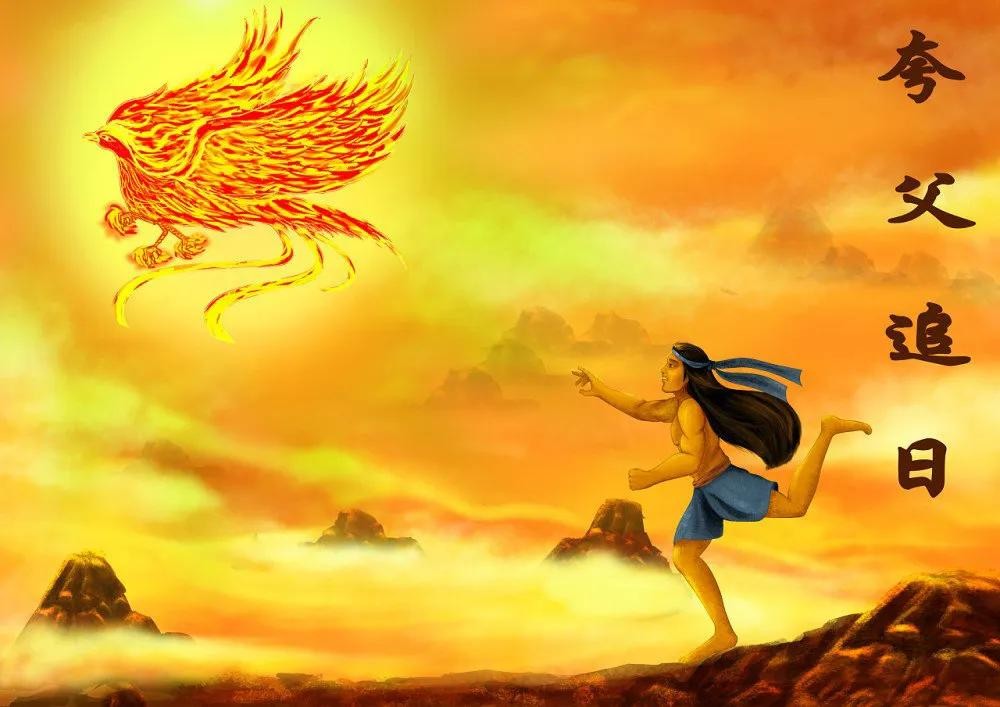 夸父与太阳赛跑,一直追赶到太阳落下的地方;他感到口渴,想要喝水,就到黄河、渭水喝水。黄河、渭水的水不够,往北去大湖喝水。还没到大湖,在半路因口渴而死。而他丢弃的手杖,就化成桃林。