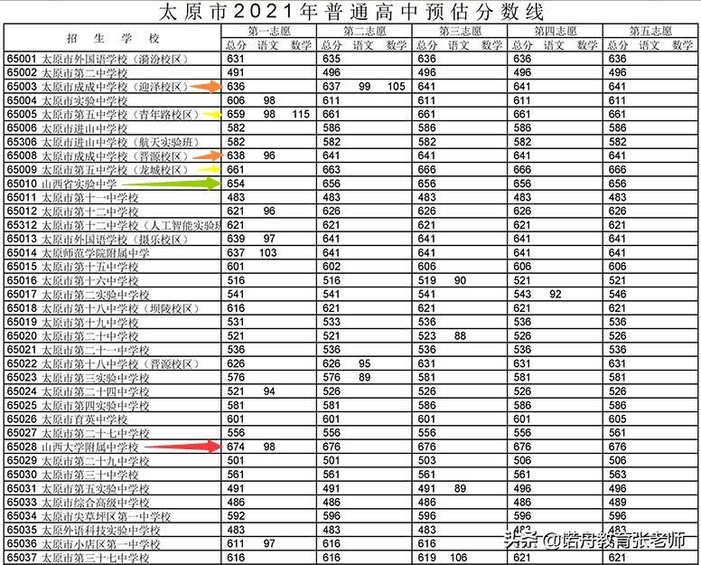 2021年7月7日,太原市教育局公布了2021年中考招生各高中院校录取分数线,公立院校中:山西大学附属中学以674分再次摘得全省高中第一的桂冠,太原五中(龙城校区)以661分为例第二,太原五中(青年路校区)以659分为例第三,山西省实验中学654分排名第四,作为山西省前三好的学校,这三所学校的排名很稳定,排名之后的是639分的太原外国语学校(摄乐校区),638分的太原市成成中学(晋源校区),637分的太原师范学院附属中学,具体信息如下: