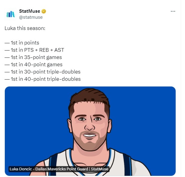 持球大核!东契奇本赛季多项数据排联盟第一 场均得分&30+三双等