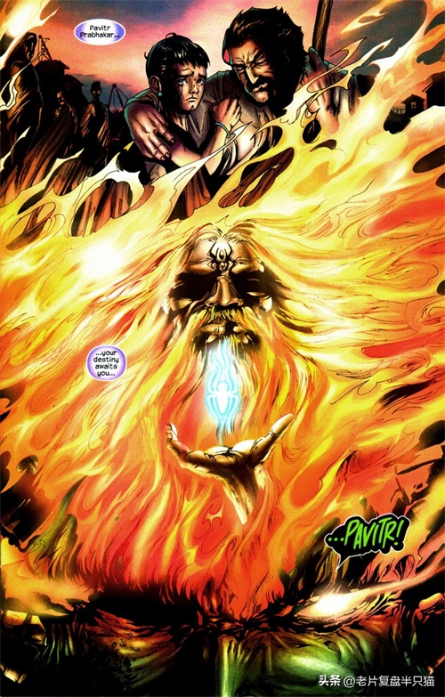 与此同时,印度蜘蛛侠被一个神秘的老头子找到,赋予了他蜘蛛超能力,并告诉他,面对命运的时刻到了。于是就有了印度蜘蛛侠。是不是特备草率,连歌舞都没有。
